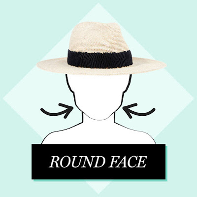 The goal is to slim the forehead to make it appear more narrow. Any brimmed style that is medium in length will achieve this.